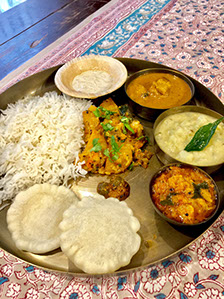 じっくり焼いた魚も添えて、現地のアーユルヴェーダドリンクとともに豪華で色彩豊かな仕上がりです。